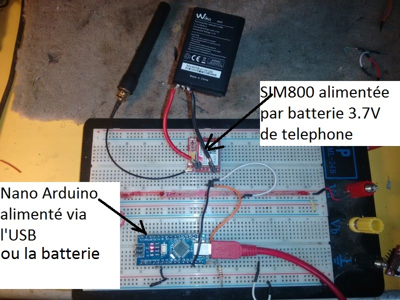 Le module SIM800 est un telephone GSM simple, sans clavier, écran,micro ni haut-parleur mais possédant une liaison série à connecter à un microcontrôleur local, ici un Arduino Nano (compatible Uno).