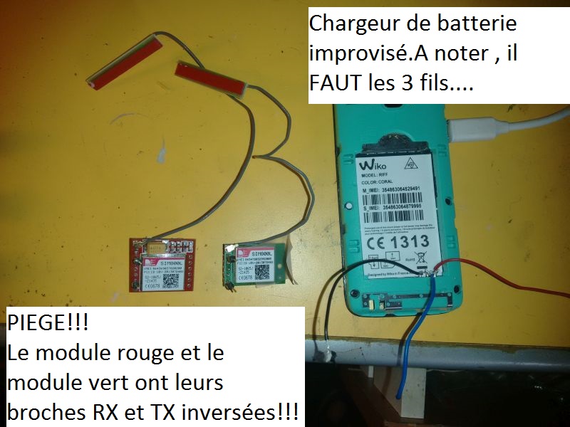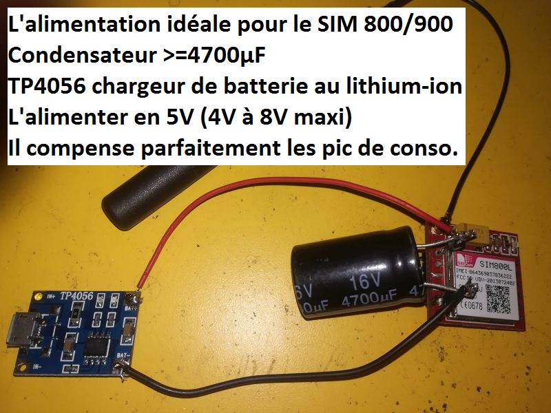 D’autre part souder les deux fils directement entre l’ alimentation et les broches + et - du SIM800.(Tout ceci peut paraître parano, mais c’est le fruit de plusieurs heures, sinon journées, de galère, car le montage semble fonctionner mais de façon aléatoire...)