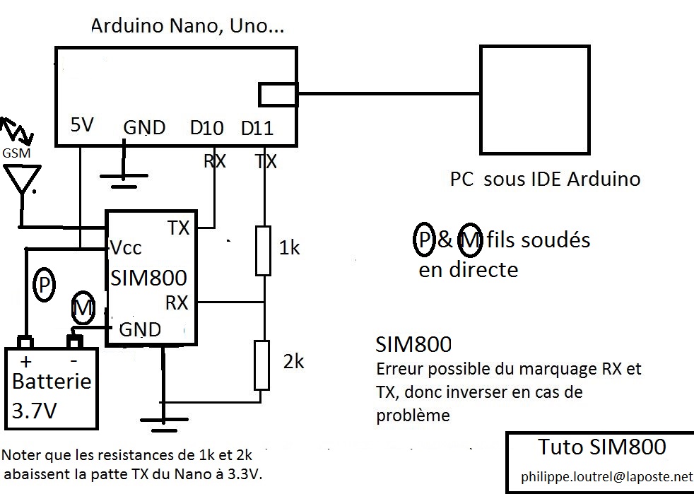 Si le Nano est alimenté en +5 V, bien que le SIM800 semble le tolérer, il est preferable de diminuer à 3.3 V la broche D11/TX par deux resistances ( par exemple 1 k et 2 k en série).