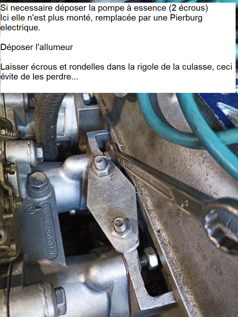 -Dévisser les 2 écrous supérieurs (13) de la pipe d'admission.C’est le seul point un peu délicat car l’accès dans les rigoles de la culasse est assez étroit. Laisser écrous et rondelles sur place pour éviter de les perdre.