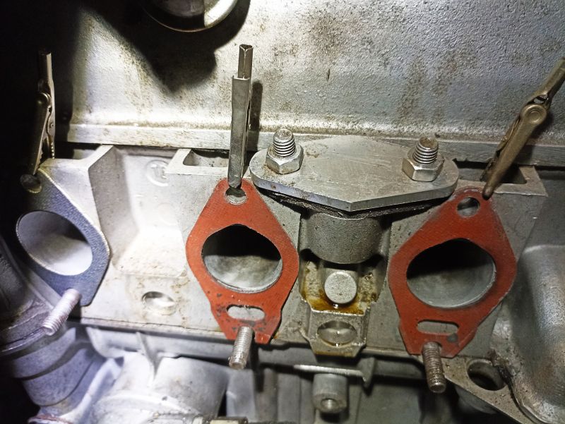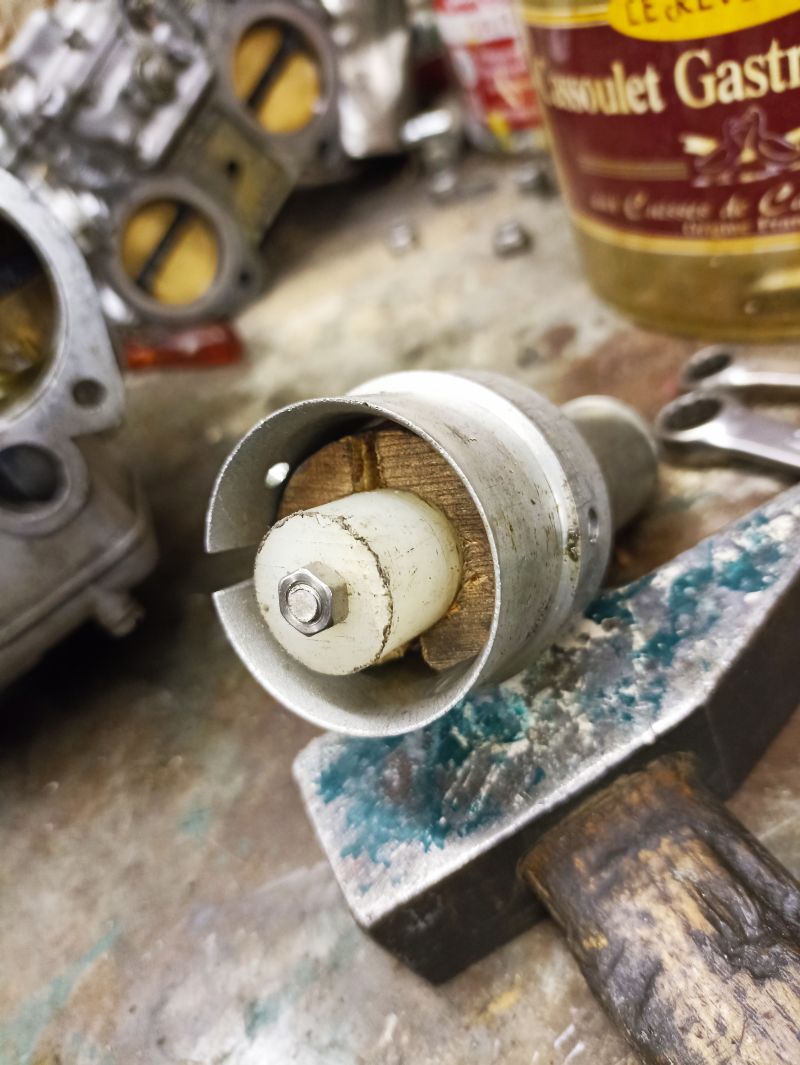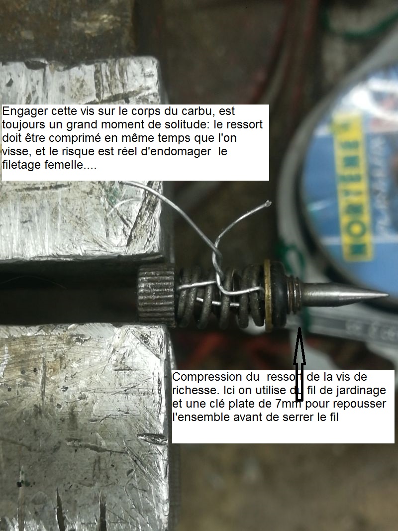 La compression du ressort aggravée par l’empilement rondelle + joint torique font que le revissage en place est toujours un moment délicat pour éviter la catastrophe : endommager le filetage sur le corps du carbu.