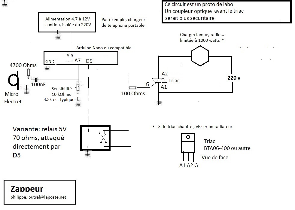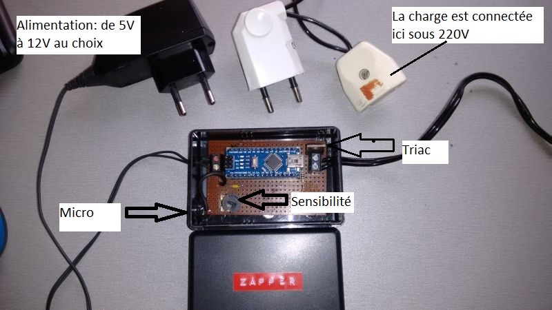 Ce premier zappeur réagit au bruit comme un claquement des deux mains. Il coupe pendant un temps adaptable dans le ’sketch’( le logiciel s’exécute sur un Arduino Nano ou compatible) l’alimentation d’une charge connectée sur le secteur 220V, par exemple une radio le temps d’une pub.En variante, il actionne un relais.
