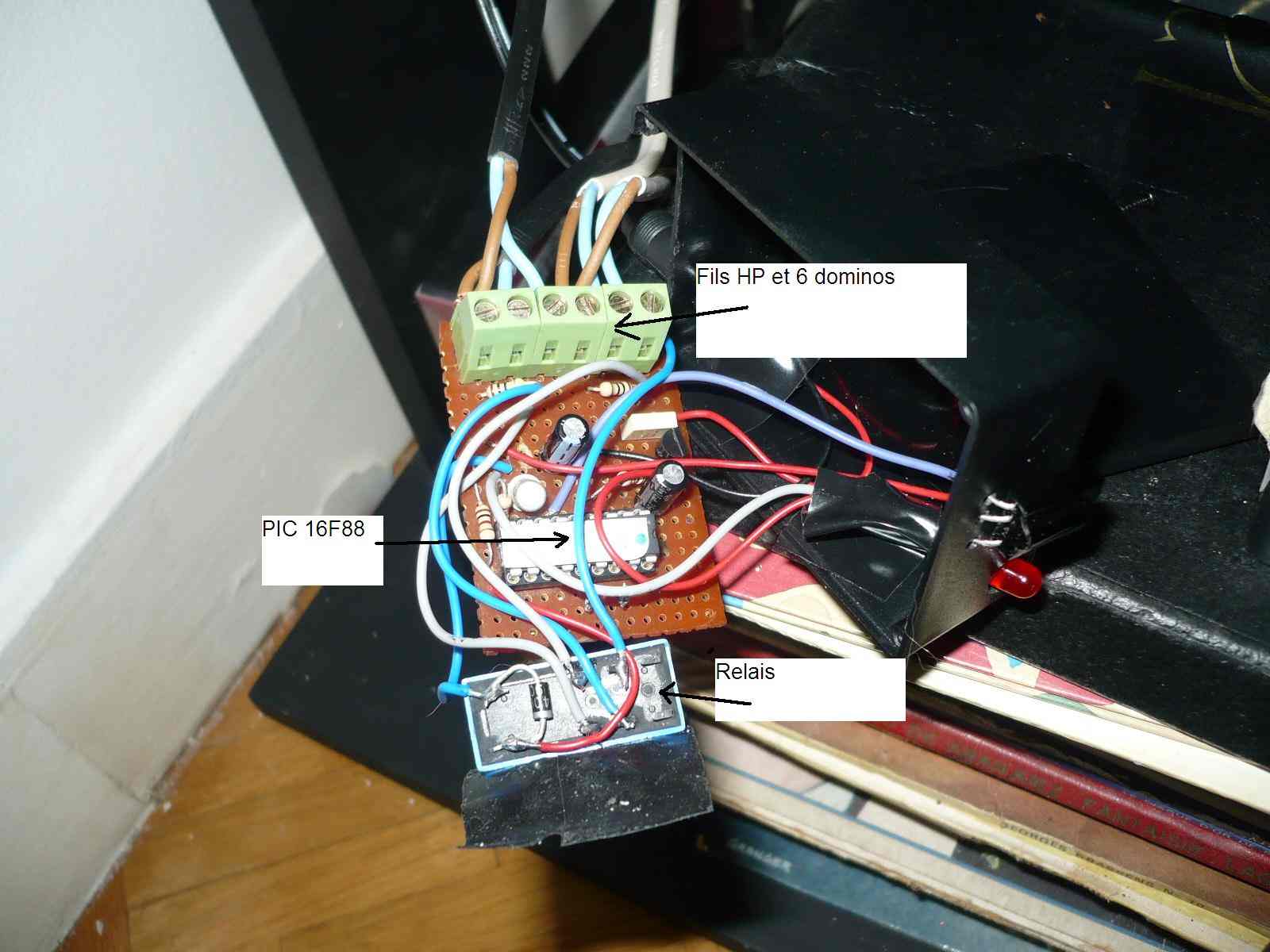Un PIC16F88 a été choisi car il dispose en interne d’un oscillateur à 4MHz, permettant de diminuer le nombre de composants, mais un 16F84 ou 16F628 feraient aussi l’affaire.