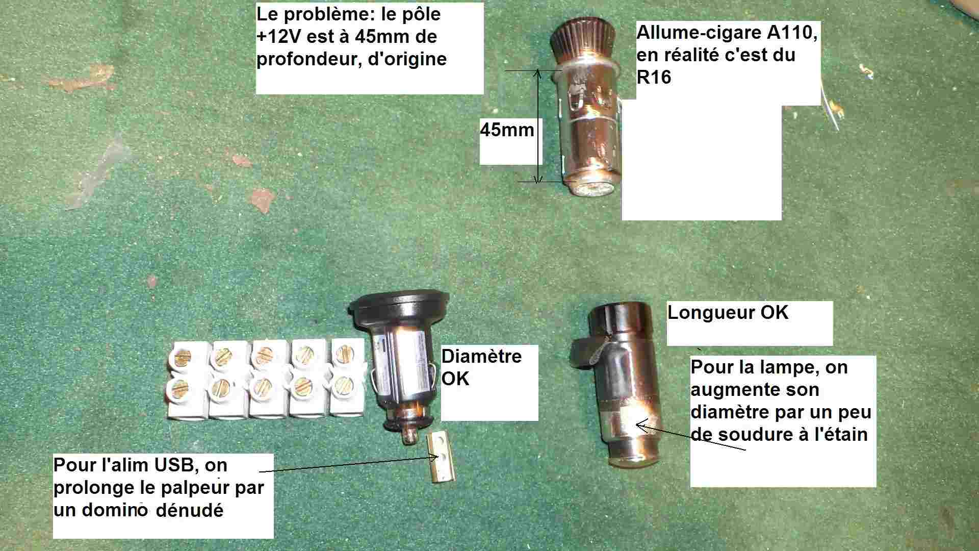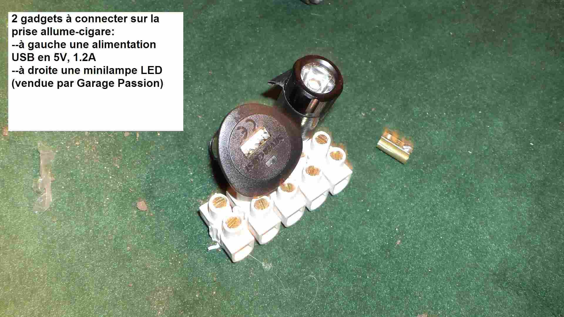 Pour utiliser les prises allume-cigare de nos anciennes avec les prises mâles actuelles, il faut souvent bricoler ! Voici le cas d’une alimentation 5V USB et d’une mini-lampe à LED :