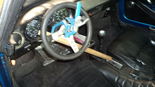 7 En braquant le volant à fond à droite puis à gauche et comptant le nombre de 1/2 tours, on détermine sa position centrale. On le verrouille comme on peut, ici avec un serre-joint et un tasseau.