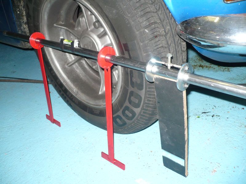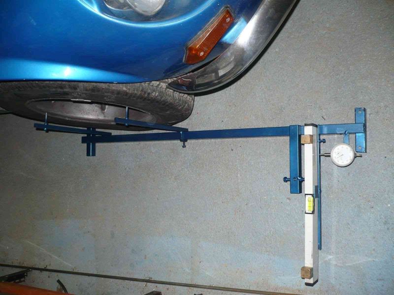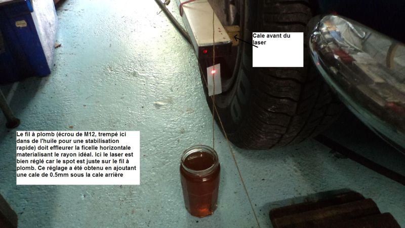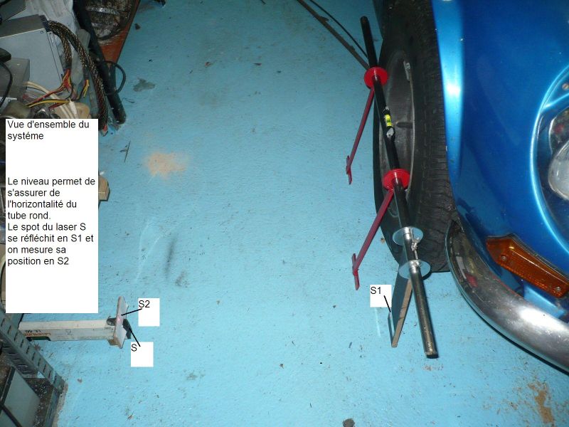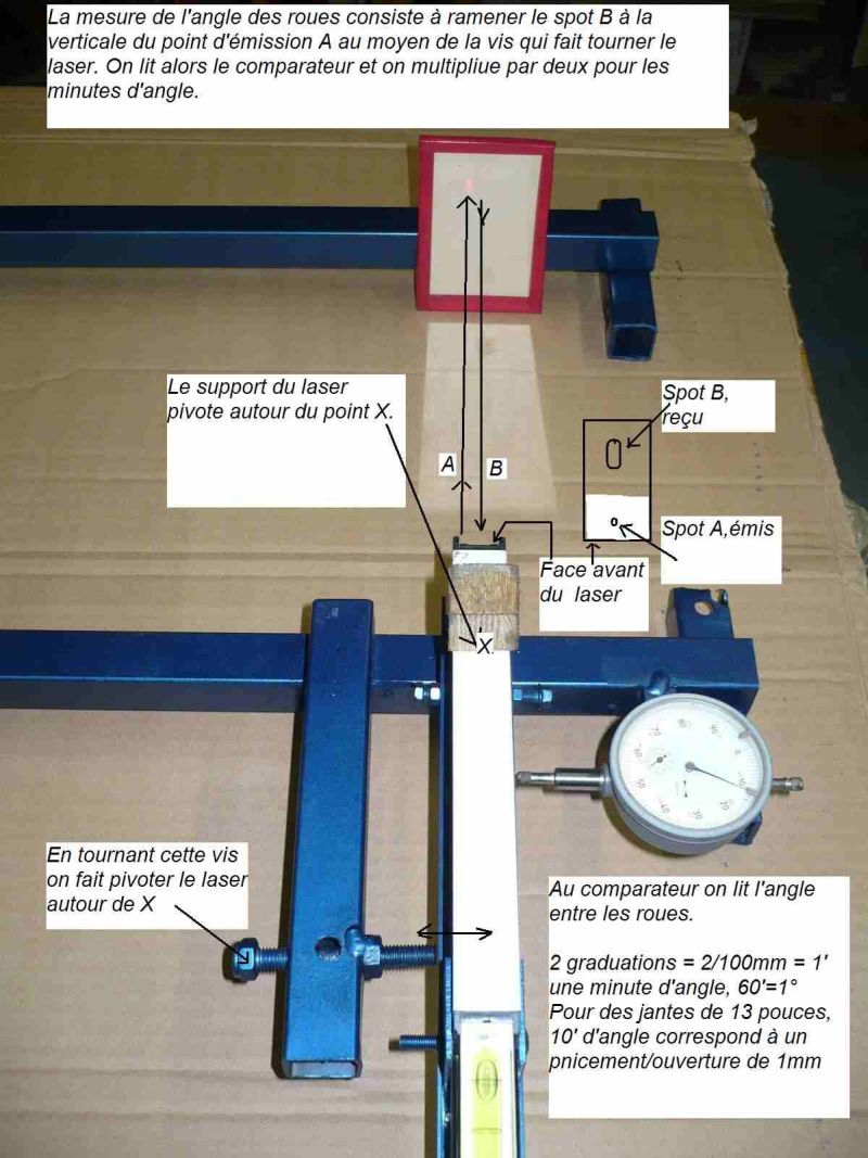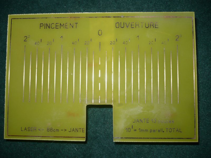 Je cogite depuis longtemps à propos d’un unique outil (un par roue en fait) facile à utiliser pour mesurer carrossage, chasse et pincement. Le système de laser transverse est intéressant et je pense l’adapter. Je vous ferai des photos de mon système, vous me direz ce que vous en pensez.