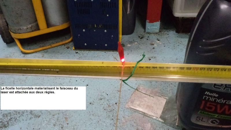 2 Tendre un fil (cordelette) entre les deux spots. On notera que la flèche inévitable du fil le fait passer sous le laser.