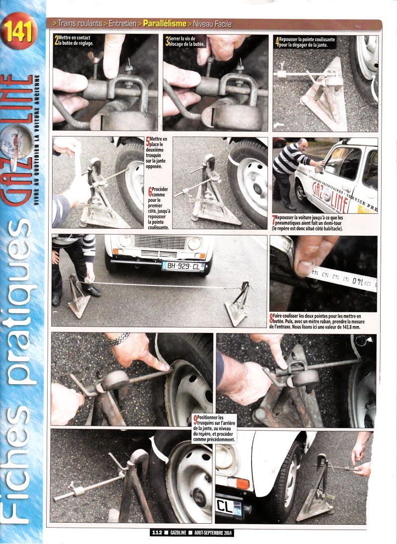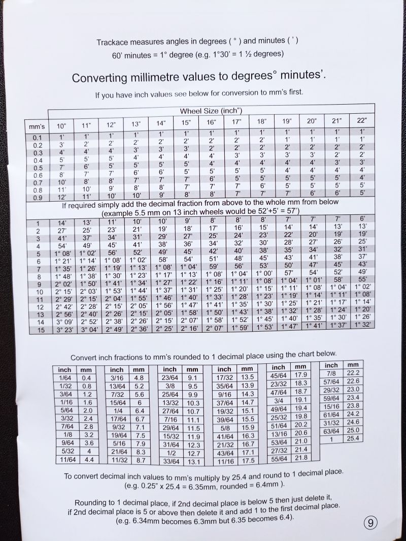 Avec des jantes de 13 pouces, on a la correspondance 1mm de parallélisme total = 10’ d’angle entre les roues.