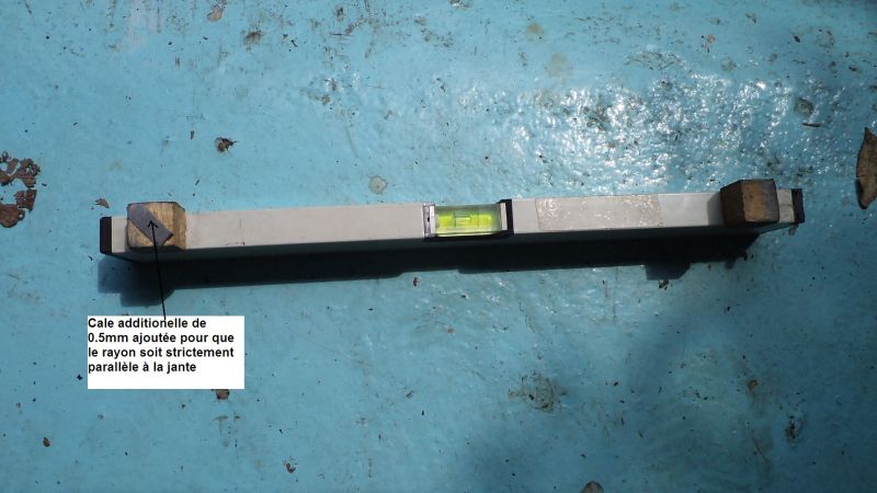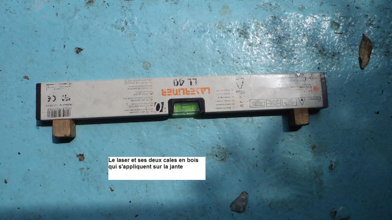 Si ce n’est as le cas, on insère entre la jante et la cale avant (ou arrière) du laser une lame, par exemple de 0.5mm, d’un jeu de cales de réglage de culbuteurs. Ceci a pour effet essentiel de déplacer les deux spots sur les règles, d’où un nouvel ajustement de la cordelette sur chaque règle.
