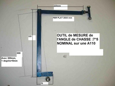 Pour mesurer la chasse, je braque à gauche de X°, je mesure le carrossage ; je braque à droite de X°, je mesure le carrossage. Reste à calculer la variation de carrossage et la multiplier par 3 si X = 10° ; multiplier par 2 si X = 15° et par 1,5 si X = 20°.