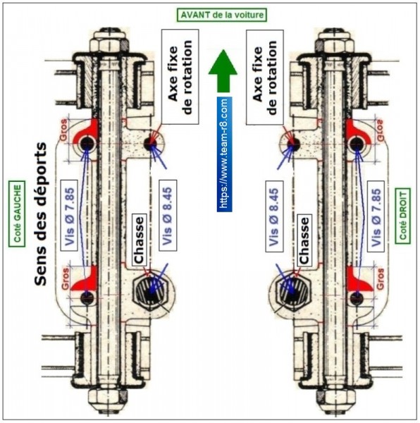On connait la valeur de l’angle de chasse à obtenir, généralement autour de 7° pour nos autos. Sur les 4 boulons M8X125 fixant un triangle inférieur, deux ont un corps de 8.5mm, à monter coté poutre. Je me demandais un peu pourquoi et je pense avoir trouvé une raison, voir les photos ci-après.