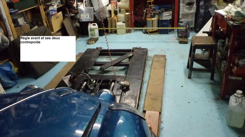 Ensuite on positionne l’appareil sur la roue AVdroite, calé à l’horizontal avec le niveau à bulle, et on lit la position du spot sur l’écran.