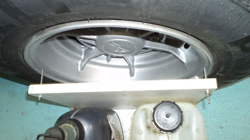 On applique donc chaque tige filetée contre la jante, on vis l’écrou jusqu’à la planche, puis on recule la tige filetée de quelques centimètre pour laisser se dégager les roues en roulant l’auto vers l’arrière.