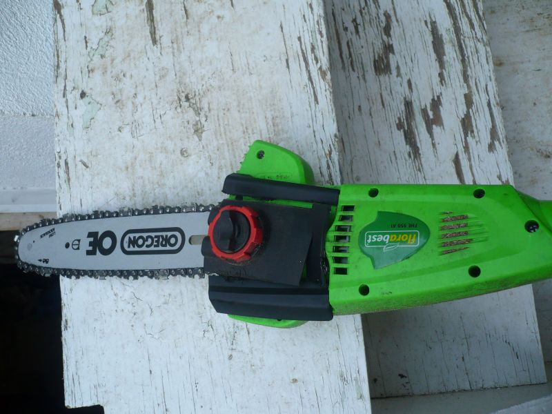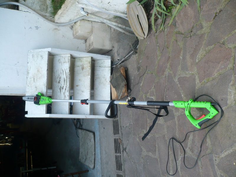 Une tronçonneuse électrique, au bout d’un manche télescopique fait un excellent taille haie à condition de découper le carter de chaîne.