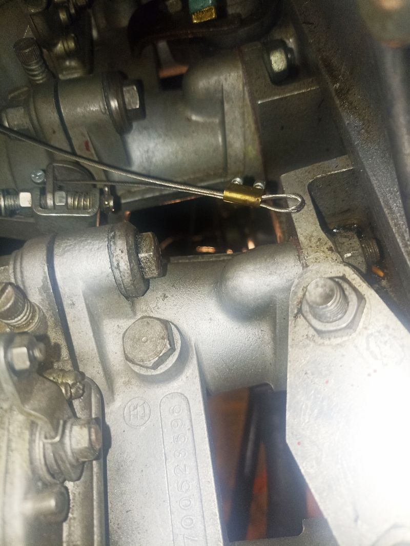 Un trou de 1.5 mm est percè dans la patte du carburateur et un câble de vélo est enfilé.